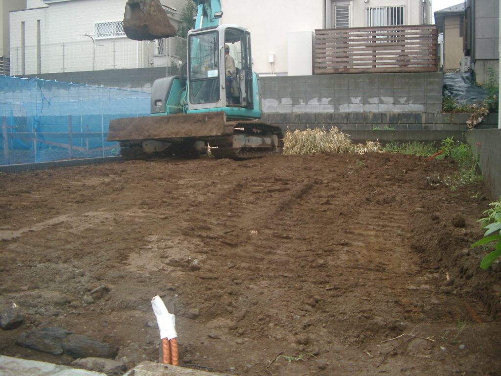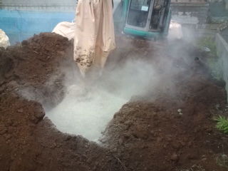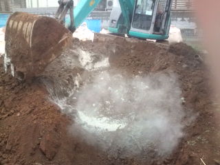 今回はレポートにより地下2mくらいまでが異常に軟弱であることが判明したので、その部分を掘削してセメント固化材8tを現地の土と混合しました。
