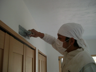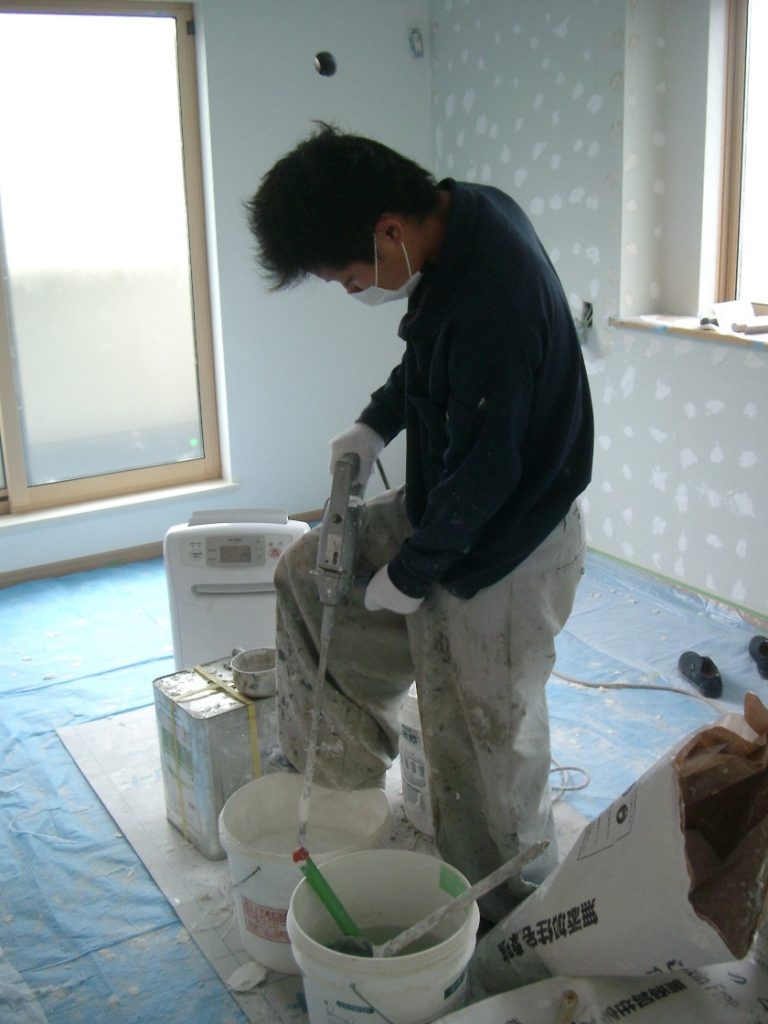 ちなみに、塗る人 ? ダイチさんが持っているのはプラスティック鏝というもので、通常漆喰塗りの際には使わないものを使って弊社では漆喰を塗ります。