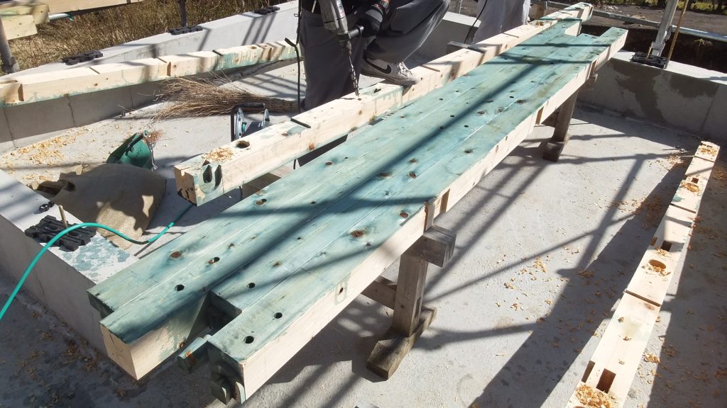 土台を敷く前に土台の裏側にホウ酸を噴霧して防蟻処理しています。