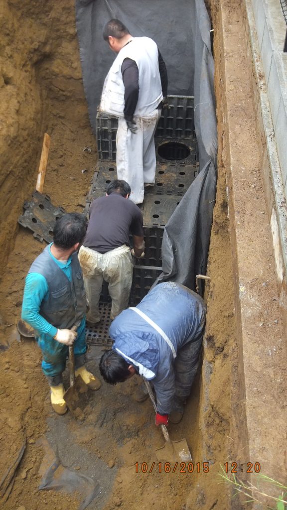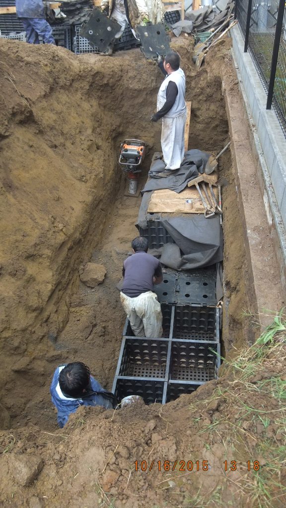 浸透枡はプラスティック製の箱を連結する形体のもので、一つが500mm角の立方体で4段すなわち2mの深さで2列、それが4.5mに渡って埋設されています。