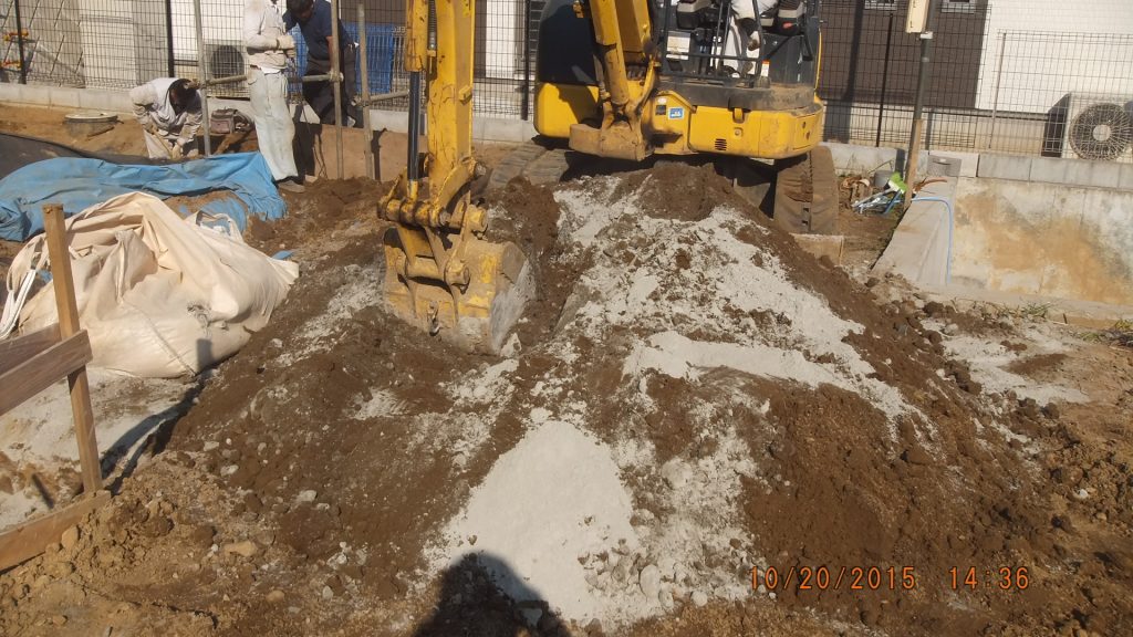 埋設されていた場所を再度地盤調査した後、日を改めてセメント固化剤を発生土に混ぜ表層改良を行うことになりました。