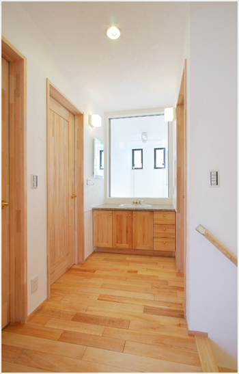 ホールの吹抜け側に無垢シンゴン米糊集成材と御影石(ピーチポリーノ)で造った洗面台を設け、その前面を強化アクリルガラスにしたことにより開放感のある明るいホールとなっています。