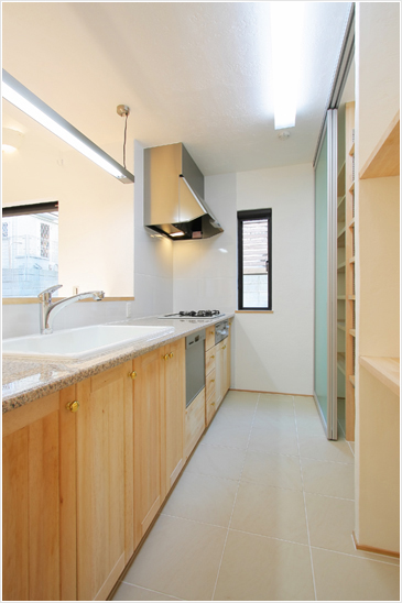 無垢シンゴン米糊集成材キッチンキャビネットを使用し、ガラストップのガスコンロと食器洗浄機をビルトインしています。キッチンの天板は御影石(ピーチポリーノ)を使用しています。写真右側の棚は全てシンゴン集成材で造作し、食器棚の扉にはアルミインテリアデザインサッシを採用しています。床はタイル貼りです。