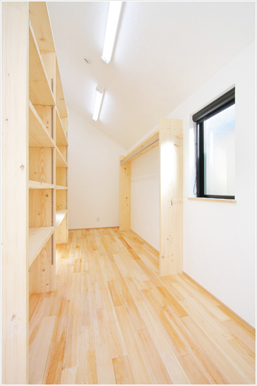 敢えて広く造ったクローゼットには大きな可動棚とハンガー棚を造作し てたっぷりと収納できるようにしましたが、2x12材を使用することによりコストアップを回避しました。