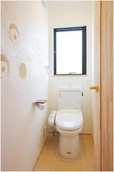 壁の予備用トイレットペーパーホルダーがアクセントになっているトイレ内部です。トイレの出入口ドア上部には棚板を設置し、収納スペースを確保しています。また、よくトイレでコーヒーを飲まれるというオーナーの依頼により設置したトイレットペーパーホルダーとタオル掛けは弊社標準のKAWAJUN製です。便器は弊社標準のINAX製ECO6のシャワートイレを採用しています。
