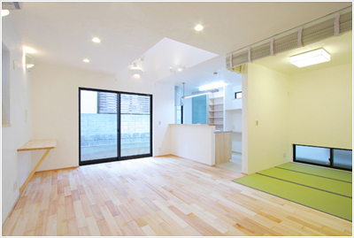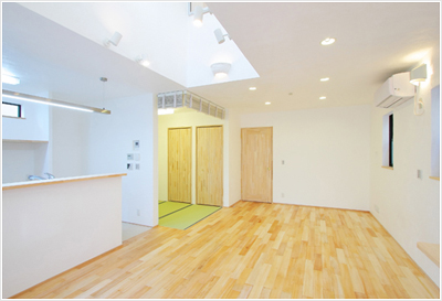 建物全ての床材はシンゴン無垢材を使用しています。リビングルーム部分に2ヵ所とキッチンの計3ヶ所に床暖房を設置しました。畳は人に優しい和紙畳を採用しています。吹抜けを通して明るい陽光がリビングルーム全体に届きます。