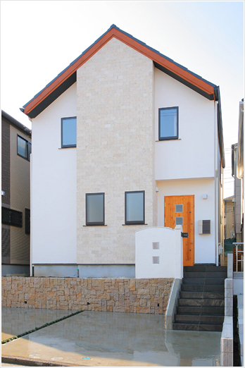 切妻屋根の建物中央部にコーラルストーン(フラット)を配し、シンメ トリーな構造にすることによりシャープでお洒落な一際目立つ外観となっています。玄関ポーチと外階段にクールーフ(グレイ)を敷き、駐車場擁壁に錆バラ石を貼っています。擁壁上の門袖はもちろん漆喰仕上です。