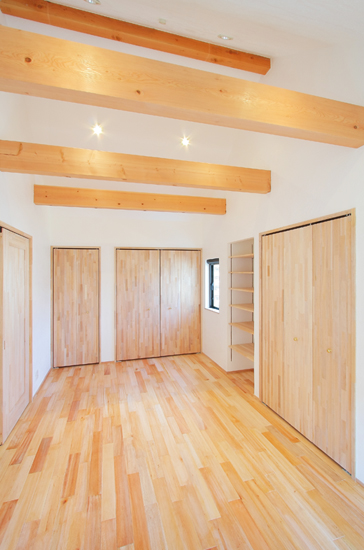 将来設置する可能性のあるロフトのために構造には関係のない化粧梁を設けアクセントとしています。もちろん全ての建具は無垢シンゴンの米糊集成材を使用しています。