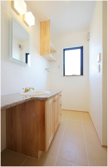 無垢シンゴン米糊集成材のキャビネットに御影石(ピーチポリーノ)製の変形天板を使うことにより充分な収納スペースを確保しました。鏡に裏側も収納スペースとなっています。床はタイル貼りです。