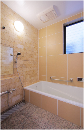 壁面はコーラルストーン(フラット)とタイル、床は滑らないようにジェットバーナー仕上の御影石(ピーチポリーノ)としています。浴槽はゆったりと入浴できる大きなホーロー浴槽を採用しました。