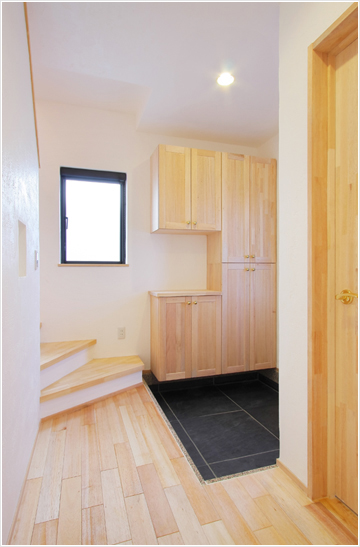 玄関にはシンゴン玄関キャビネットを設置し、玄関土間には屋根に使っ たものと同一のクールーフ(グレイ)貼りとなっています。階段を廻り込むように設置したため少し緩やかな階段となっています。