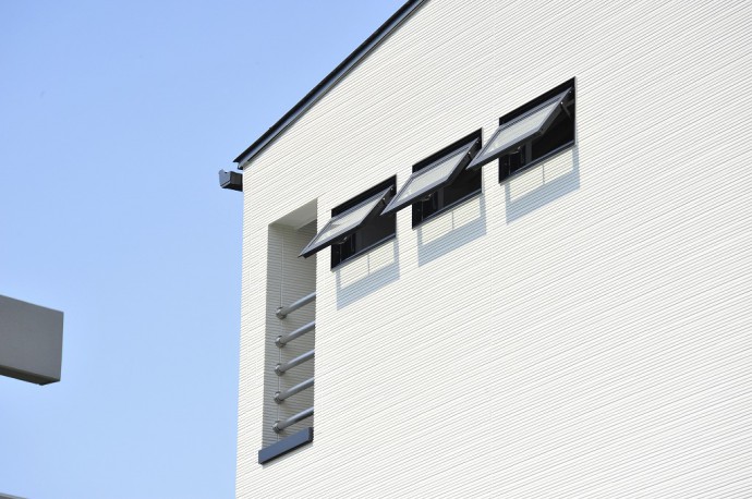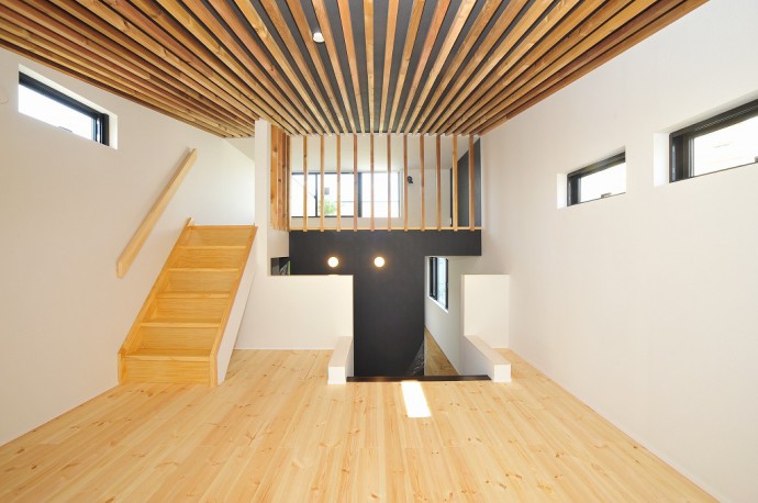 スキップフロアの中3階の天井と塔屋の仕切ルーバーにはレッドシダーの無垢材を荒々しく使い、北面サッシ窓から屋上からの柔らかい陽光も採り入れています。