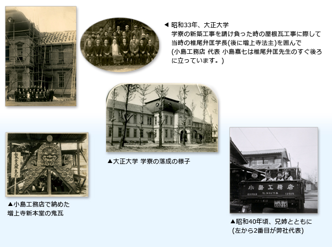 大正12(1923)年に小島由三郎の長子である小島清治が現在の東京都新宿区弁天町に進出し、瓦販売業ならびに屋根工事業として小島工務店を営む。